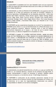 La sanción más dura recayó sobre el presidente del club, Juan Sebastián Verón, quien fue suspendido por seis meses. En tanto, el capitán Santiago Núñez deberá cumplir tres meses sin poder ejercer ese rol.