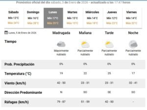 Según el SMN, “el área será afectada por vientos del sector norte, con velocidades estimadas entre 40 y 60 km/h y ráfagas que podrían alcanzar los 85 km/h, pudiendo ser superadas de manera local”.