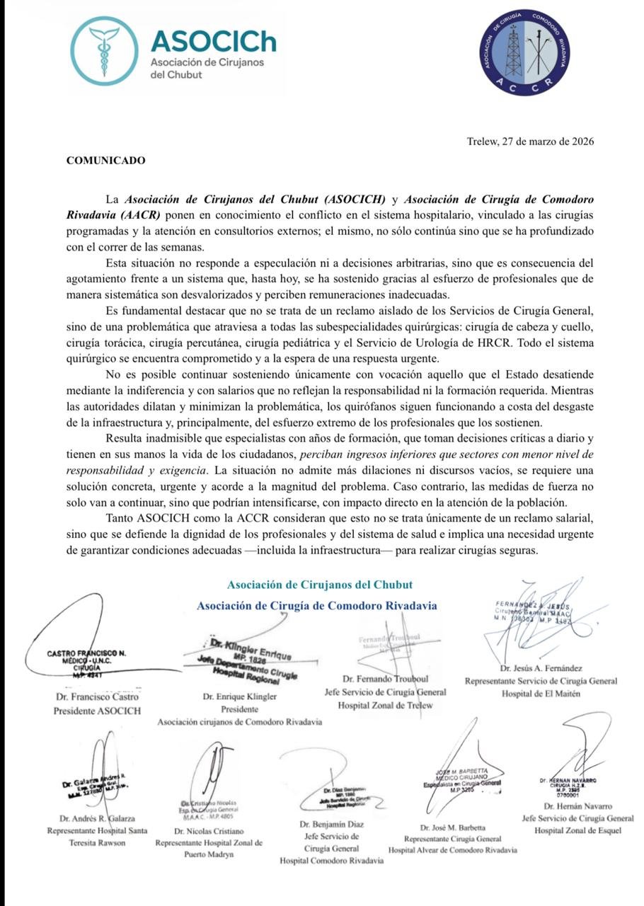 El sistema de salud en Comodoro Rivadavia y toda la provincia atraviesa un momento crítico y los cirujanos decidieron hacerlo público.