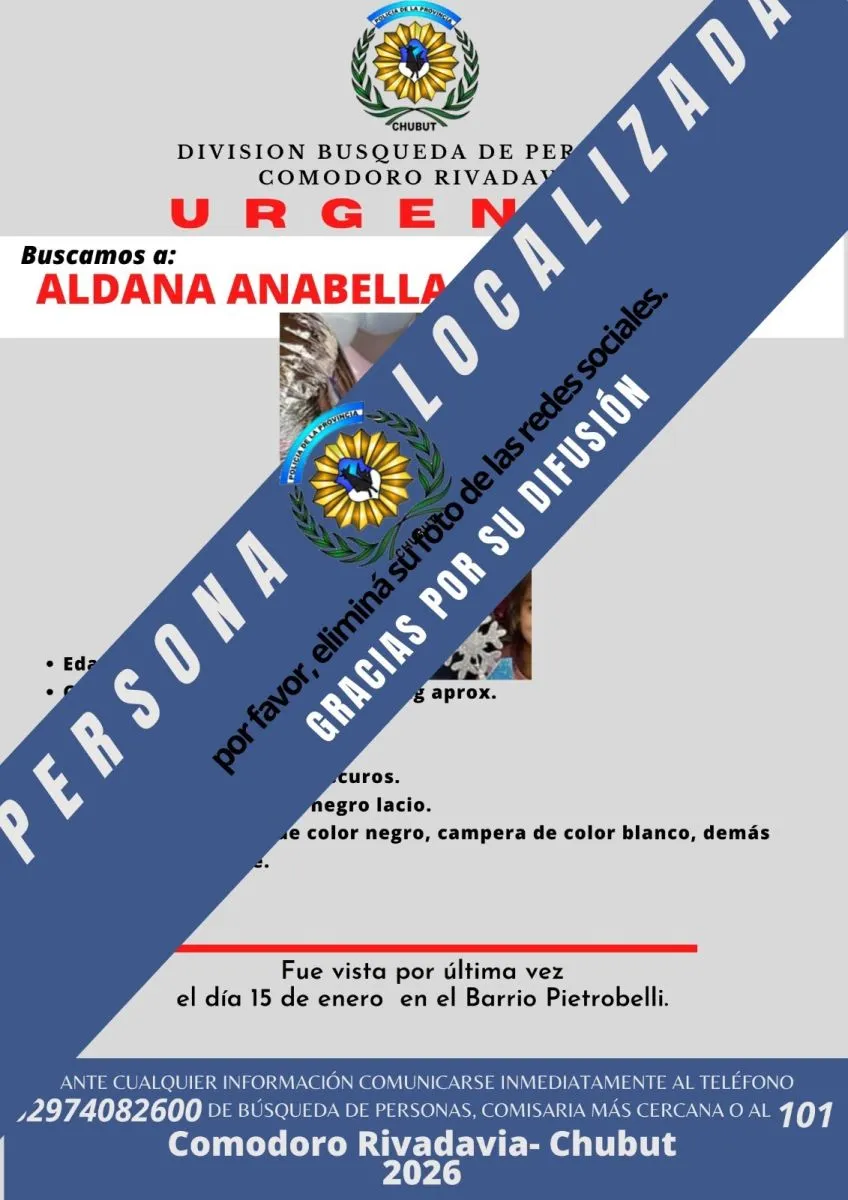 La búsqueda de Aldana Gallardo, intensamente difundida desde el jueves tras su desaparición en el barrio Pietrobelli, terminó con un alivio para todos. La mujer de 30 años fue hallada este viernes por la División de Búsqueda de Personas y la Policía de Comodoro Rivadavia confirmó que no presentaba lesiones ni requería asistencia médica.