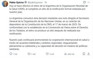 Argentina ya no forma parte de la OMS. La confirmación llegó por parte del canciller Pablo Quirno, quien recordó que la decisión había sido comunicada en marzo de 2025.