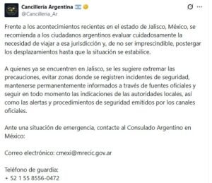 Para quienes ya se encuentran en México, la Cancillería recomendó extremar precauciones, seguir los canales oficiales de información y respetar estrictamente las alertas de seguridad locales.