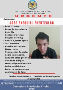 En paralelo, también se mantiene activo otro pedido de búsqueda por un segundo hombre en la ciudad, por lo que se refuerza el pedido de difusión y colaboración. Se trata de José Exequiel Fuentealba de 32 años.
