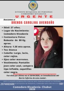 Hay preocupación en Comodoro por la búsqueda de Brenda Carolina Avendaño, de 27 años, quien es intensamente buscada desde el 26 de abril, cuando fue vista por última vez en inmediaciones de barrio Ceferino.