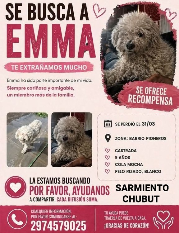Una familia de la localidad de Sarmiento se encuentra movilizada en una angustiosa búsqueda para dar con el paradero de Emma, su mascota que se perdió hace casi un mes. Según informaron sus dueños a través de un afiche de difusión, la perrita desapareció el pasado 31 de marzo en inmediaciones del Barrio Pioneros.