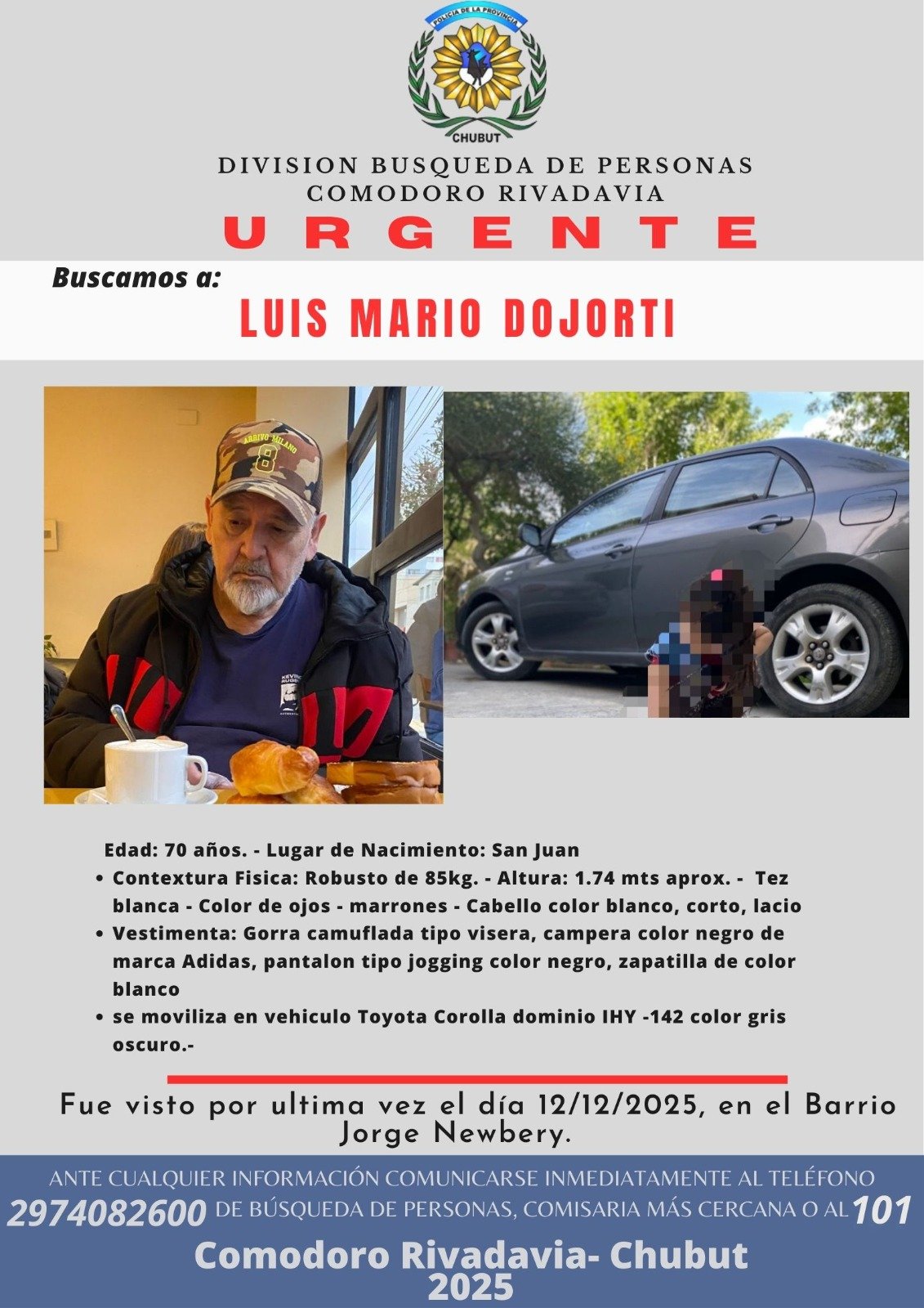 La División Búsqueda de Personas de Comodoro Rivadavia difundió un pedido urgente para dar con el paradero de Luis Mario Dojorti, un vecino de 70 años que padece alzhéimer y que fue visto por última vez este 12 de diciembre de 2025, en inmediaciones del barrio Jorge Newbery.