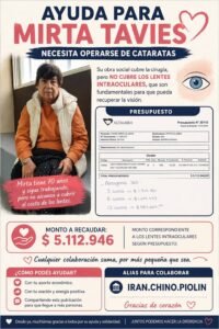 Por ese motivo, familiares y allegados iniciaron una colecta para reunir el dinero necesario. El monto a recaudar asciende a $5.112.946, correspondiente al valor de los lentes según el presupuesto médico. En la imagen difundida, se detalla que Mirta continúa trabajando, pero aun así no logra cubrir el costo.