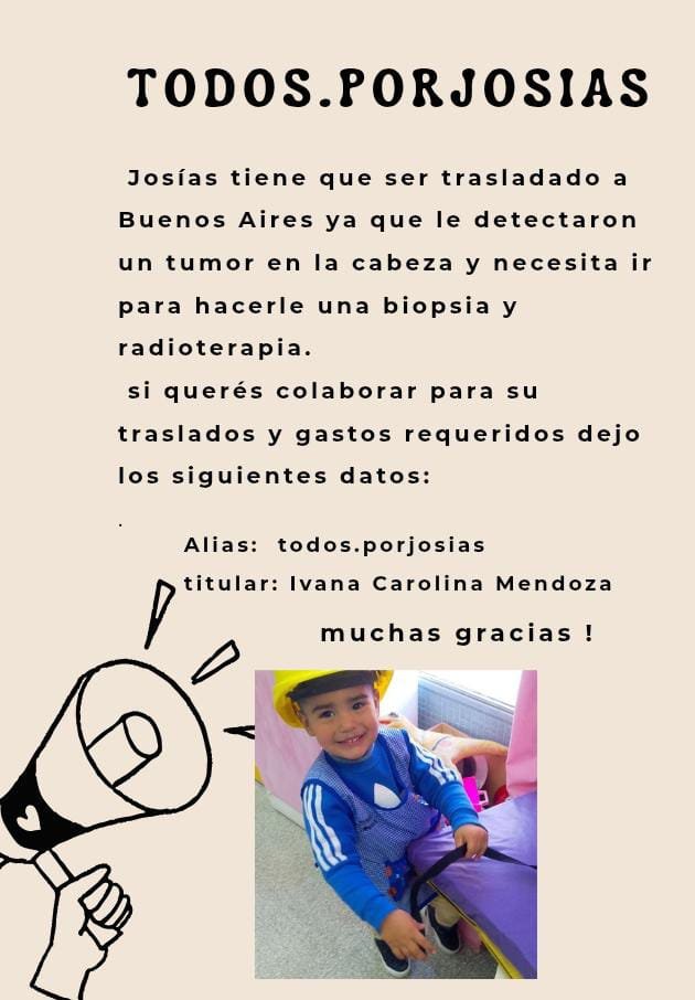 Josías necesita viajar a la capital para someterse a una biopsia y radioterapia. Dada la complejidad de su situación, se ha iniciado una campaña para recaudar fondos que cubran los traslados y los gastos requeridos para su estadía y atención en Buenos Aires.
