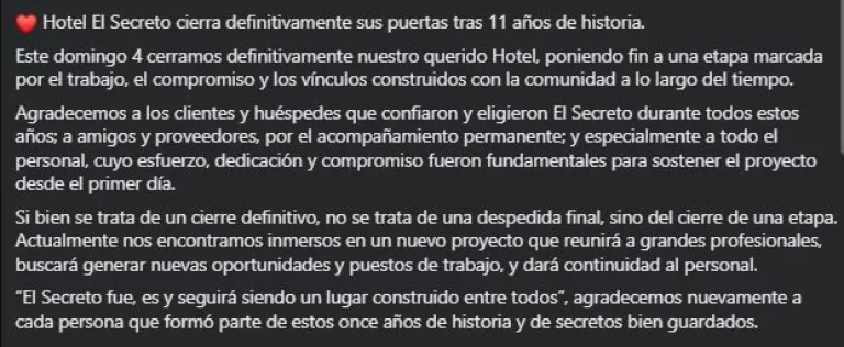Aunque el hotel cerró de forma definitiva, desde la empresa aclararon que no se trata de una despedida final. Actualmente, El Secreto se encuentra trabajando en un nuevo proyecto, con el objetivo de generar nuevas oportunidades laborales y dar continuidad al personal.