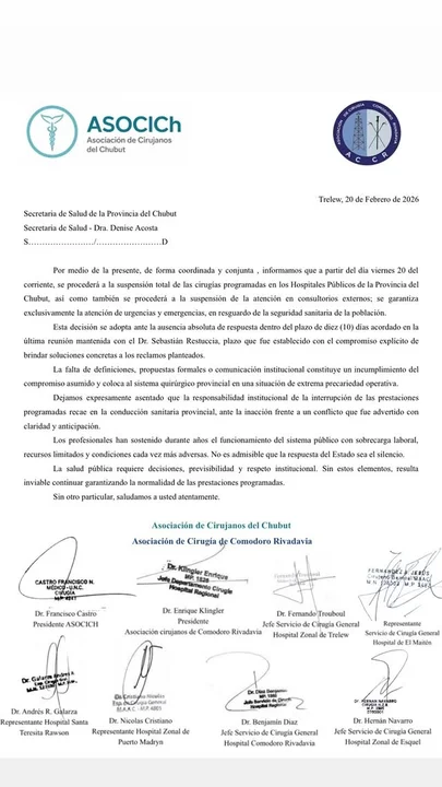 Desde este viernes 20 de febrero, los cirujanos de Chubut suspendieron todas las cirugías programadas y la atención en consultorios externos en hospitales públicos de la provincia. ¿Qué queda en pie? Solo urgencias y emergencias. La medida fue anunciada por la Asociación de Cirujanos del Chubut tras denunciar que no hubo respuestas oficiales luego de un plazo de diez días acordado con autoridades sanitarias.
