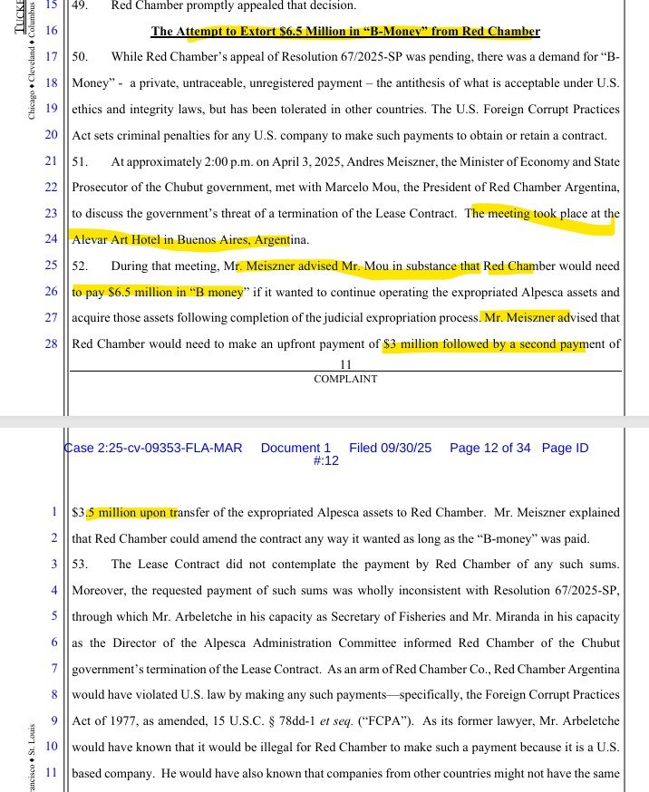 El corazón de la acusación es un episodio que, según Red Chamber, ocurrió el 3 de abril de 2025 a las 14, en el hotel Alvear Art de la ciudad de Buenos Aires. Allí, siempre de acuerdo con el texto presentado en California, el entonces ministro de Economía y actual fiscal de Estado de Chubut, Andrés Meiszner, se reunió con Marcelo Mou, presidente de Red Chamber Argentina. Durante ese encuentro se habría planteado el punto más explosivo del caso: la empresa sostiene que Meiszner le propuso pagar US$ 6,5 millones en “B-money” para poder continuar operando la planta expropiada de Alpesca y acceder a la compra de las instalaciones una vez finalizado el proceso judicial de expropiación. El pago, según el escrito, debía realizarse en dos tramos: US$ 3 millones iniciales y US$ 3,5 millones restantes al momento de la transferencia de los activos.