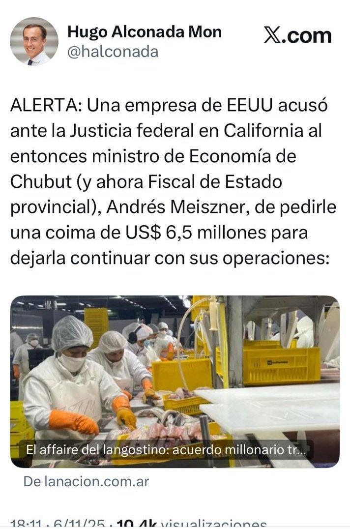 La pelea por el negocio del langostino patagónico cruzó fronteras y terminó en una corte federal de Estados Unidos. Allí, la empresa pesquera Red Chamber describió un presunto pedido de coimas por US$ 6,5 millones atribuido a un funcionario del gobierno de Chubut, en el marco del conflicto por la planta de la exAlpesca en Puerto Madryn.