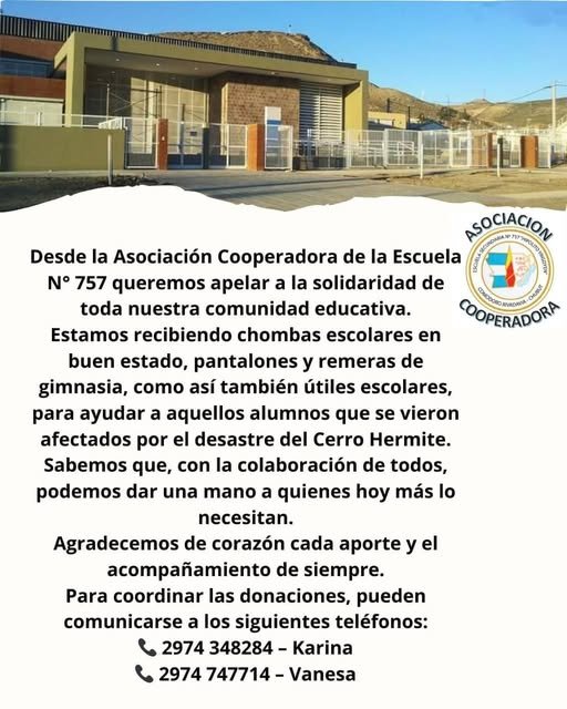 La colecta por el cerro Hermitte ya está en marcha. Tras el derrumbe que obligó a evacuar a más de 100 familias en Km 3, la Cooperadora de la Escuela N° 757 “Hipólito Yrigoyen” lanzó una campaña urgente para juntar ropa y útiles escolares para los chicos damnificados. Porque muchos se fueron con lo puesto. Literal.