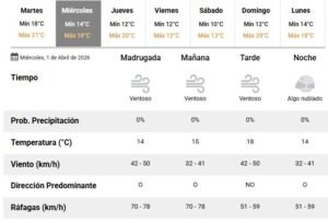 El protagonista del día será el viento del oeste, que soplará de forma constante durante toda la jornada. Se esperan velocidades entre 32 y 50 km/h, con ráfagas que podrían llegar hasta los 78 km/h, especialmente durante la madrugada y la mañana.