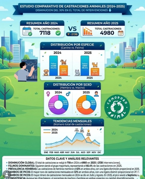 La situación del control de perros y gatos en Comodoro Rivadavia llegó a su límite. Según los registros estadísticos del servicio veterinario municipal, el 2025 cerró con apenas 4.980 castraciones, una caída fuertísima frente a las 7.118 que se habían logrado en 2024. Esta reducción no es solo un número frío en una planilla de transparencia, sino que representa un golpe directo a la salud pública de todos los vecinos.