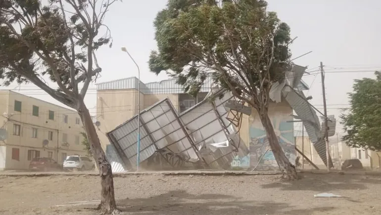 Los primeros estragos del viento llegaron antes del mediodía. Voladuras de techos, roturas en viviendas y daños en establecimientos. No es novedad que Comodoro tenga mala relación con los techos, pero hoy el nivel de violencia del viento elevó la pelea a categoría internacional.
