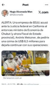 Según el escrito, el 3 de abril de 2025, el entonces ministro de Economía y actual fiscal de Estado del Chubut, Andrés Meiszner, se reunió con el presidente de Red Chamber Argentina, Marcelo Mou, en el hotel Alvear Art de Buenos Aires. Allí, siempre de acuerdo a la versión judicial, el funcionario habría mencionado un pago de US$ 6,5 millones en “B-money” —una forma de transferencia no rastreable— para permitir que la empresa continuara operando y adquiriera los activos de la planta expropiada.