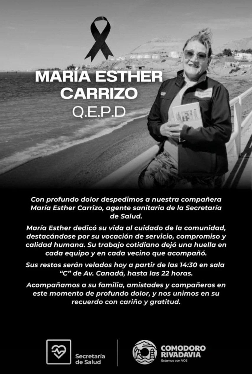 La comunidad de Comodoro Rivadavia se encuentra conmovida tras confirmarse el fallecimiento de María Esther Carrizo, una reconocida agente sanitaria de la Secretaría de Salud local. Carrizo, cuya trayectoria estuvo marcada por un fuerte compromiso social y vocación de servicio, dejó una huella profunda tanto en sus compañeros de trabajo como en los vecinos de los sectores donde prestaba asistencia.