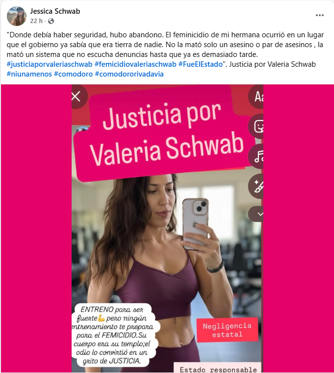 El posteo estuvo acompañado por consignas que ya son bandera: #JusticiaPorValeriaSchwab, #NiUnaMenos y #FueElEstado. No como hashtags de moda, sino como gritos urgentes.