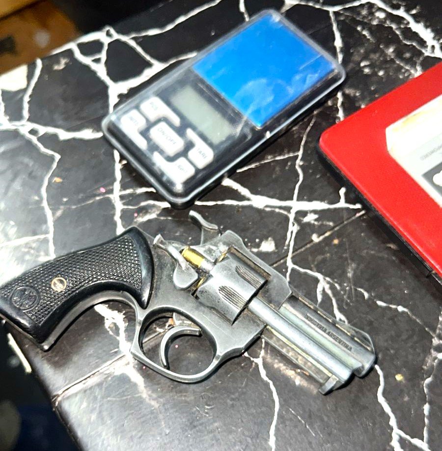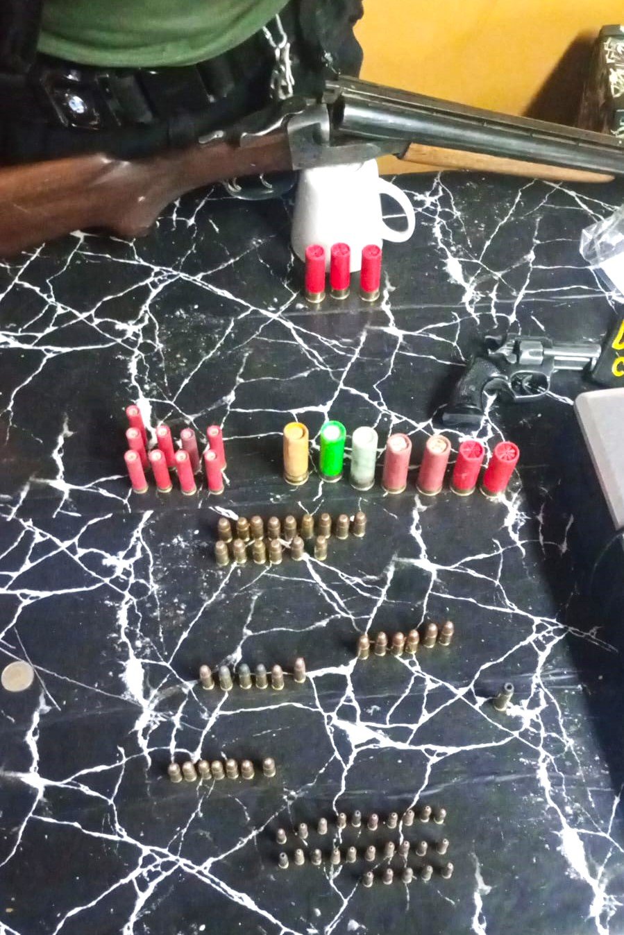 Un arsenal compuesto por una escopeta de doble caño calibre 16 y un revólver calibre 22 con municiones en su tambor.
