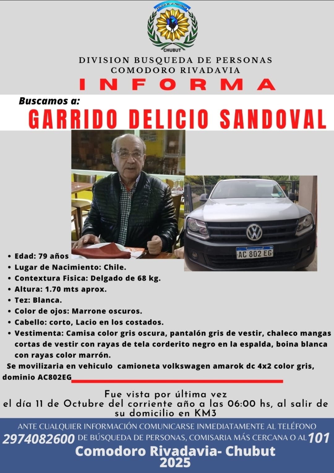 Máxima difusión y ojos bien abiertos en Comodoro: la División de Búsqueda de Personas activó un rastrillaje urgente para dar con el paradero de Garrido Delicio Sandoval, un adulto mayor de 79 años, de nacionalidad chilena.