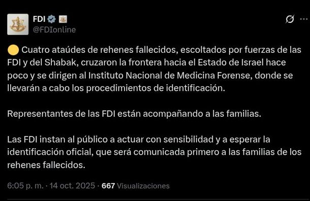 La entrega forma parte del plan de paz impulsado por Estados Unidos, que incluye la liberación de los rehenes restantes y el intercambio de restos. Según medios israelíes, los ataúdes fueron recibidos en una breve ceremonia militar antes de su traslado.