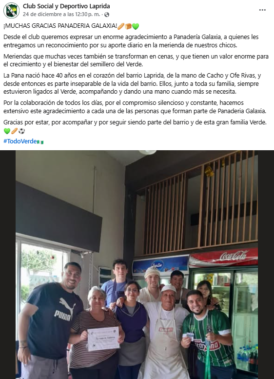 El reconocimiento del Club Laprida no es solo a una panadería, sino a una forma de estar en el barrio. Desde la institución lo dijeron claro: el rol social que cumple Panadería Galaxia es fundamental.