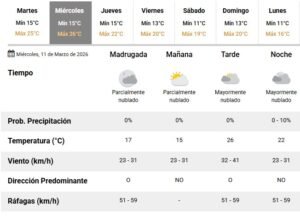 Respecto al viento, durante la mañana estará prácticamente ausente, pero las condiciones cambiarán hacia la tarde y la noche, cuando se prevé la presencia de ráfagas que podrían oscilar entre los 51 y 59 km/h.