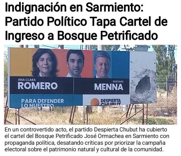 La campaña electoral en Chubut sumó un nuevo y polémico capítulo que está generando una ola de indignación, especialmente en Sarmiento. Un medio local de Sarmiento denunció públicamente lo que calificó como una «enorme falta de respeto» por parte de la fuerza política Despierta Chubut: tapar completamente el cartel de ingreso al Bosque Petrificado José Ormachea para colocar propaganda de la candidata a diputada Ana Clara Romero.