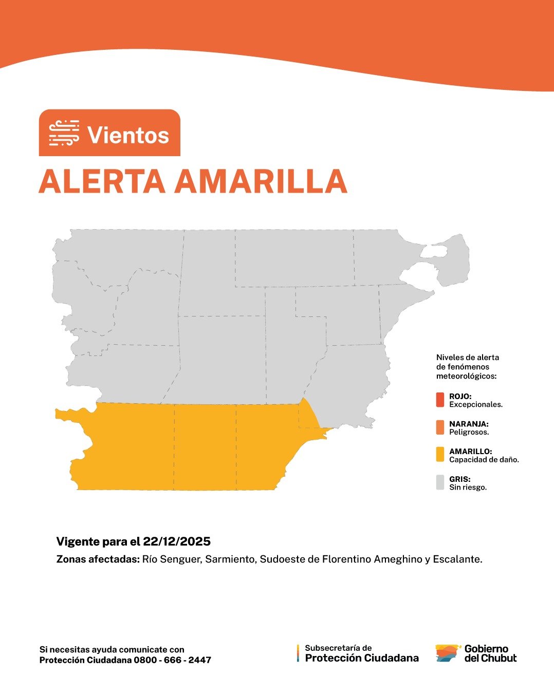 La alerta amarilla por vientos en Chubut fue emitida por el Servicio Meteorológico Nacional y actualizada por la Subsecretaría de Protección Ciudadana. El fenómeno está previsto para la madrugada y la tarde del lunes 22 de diciembre, con vientos predominantes del sector oeste.