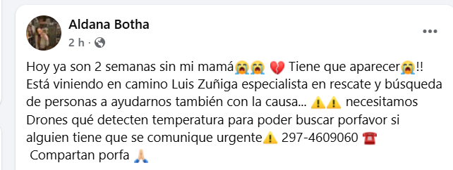Aldana Botha, hija de Juana, no para: “Esa zona es inmensa, parece un laberinto. No queremos perder la esperanza”. Hoy, posteo doloroso: “Hoy ya son 2 semanas sin mi mamá 😭💔. Tiene que aparecer”. Y suma: Luis Zuñiga, especialista en búsquedas, viene en camino.